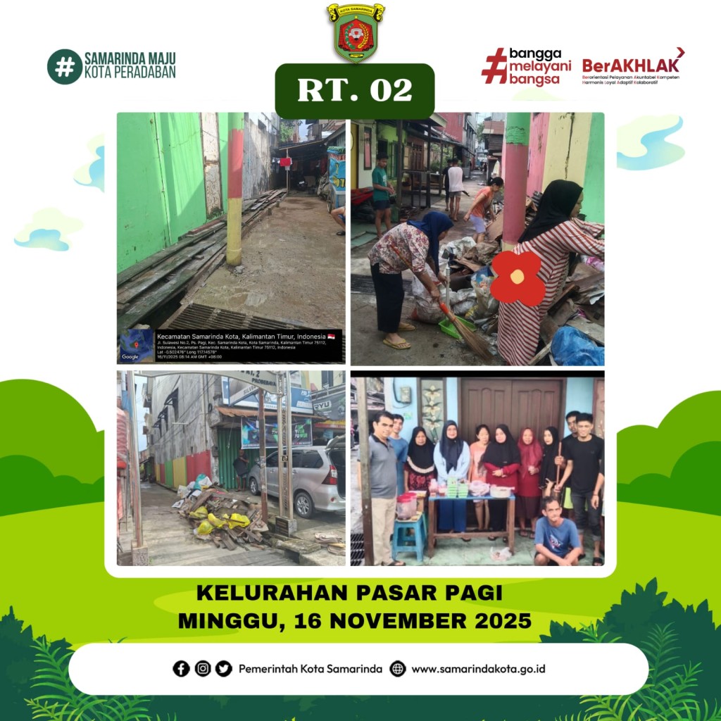 Gotong Royong di wilayah RT. 02 Jl. Gajah Mada Gg. 2 dipimpin lgsg oleh ketua RT. 02 diikuti dgan warga sekitar. Dalam kegiatan ini juga turut hadir Kasi Ekobang & Lh Kelurahan Pasar Pagi. Kegiatan ini dilaksanakan guna menciptakan lingkungan yang bersih & nyaman.