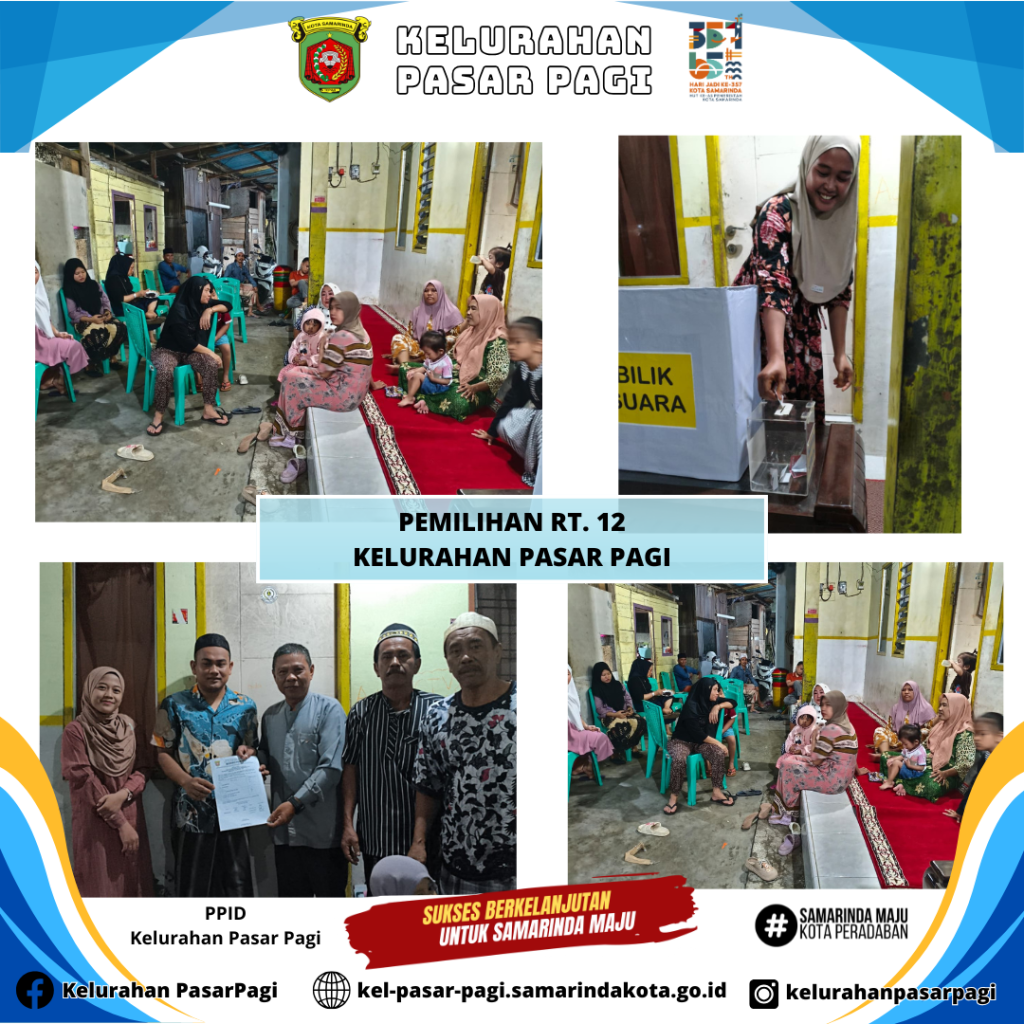 Pemilihan Ketua RT. 12 Kelurahan Pasar Pagi di Jl. KH. Abul Hasan Gg.7. Pemilihan RT.12 ini terdiri dari 2 kandidat yaitu nomor urut 01 Bapak Noven & nomor urut 02 Ibu Rahmawati. Pemilihan ini dihadiri Kasi Pemerintahan & Trantib Kelurahan Pasar Pagi beserta staff dan warga sekitar. Pada pemilihan ini Bapak Noven mendapatkan suara terbanyak dan terpilih menjadi Ketua RT. 12 Tahun Periode 2026-2030.