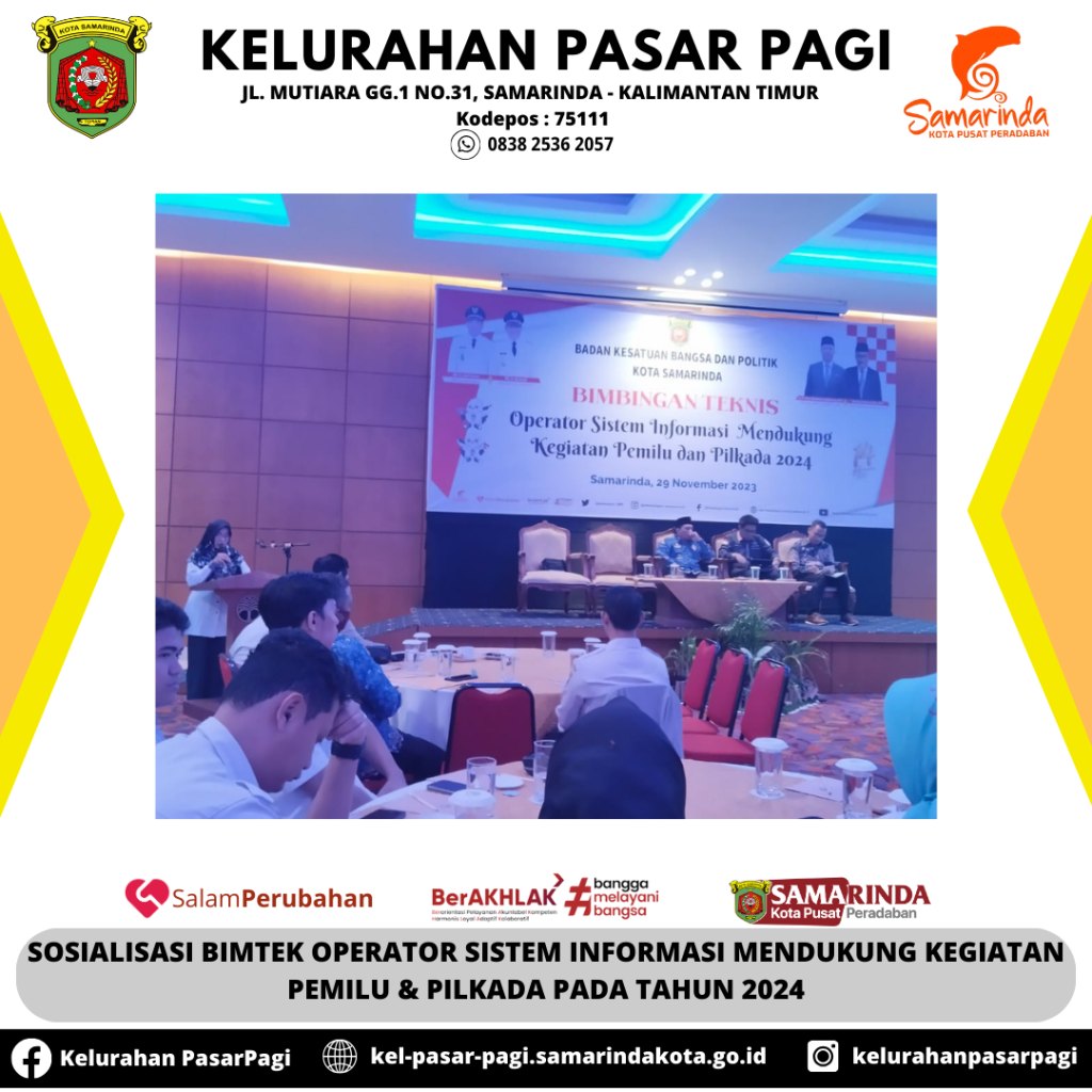 Kegiatan Sosialisasi Bimtek Operator Sistem Informasi untuk mendukung Kegiatan Pemilu dan Pilkada pada tahun 2024 yang dimulai Pukul 08.00 Wita - selesai, acara ini bertempat di Hotel Puri Senyiur (Samarinda Ball Room) Jl. Ruhui Rahayu.