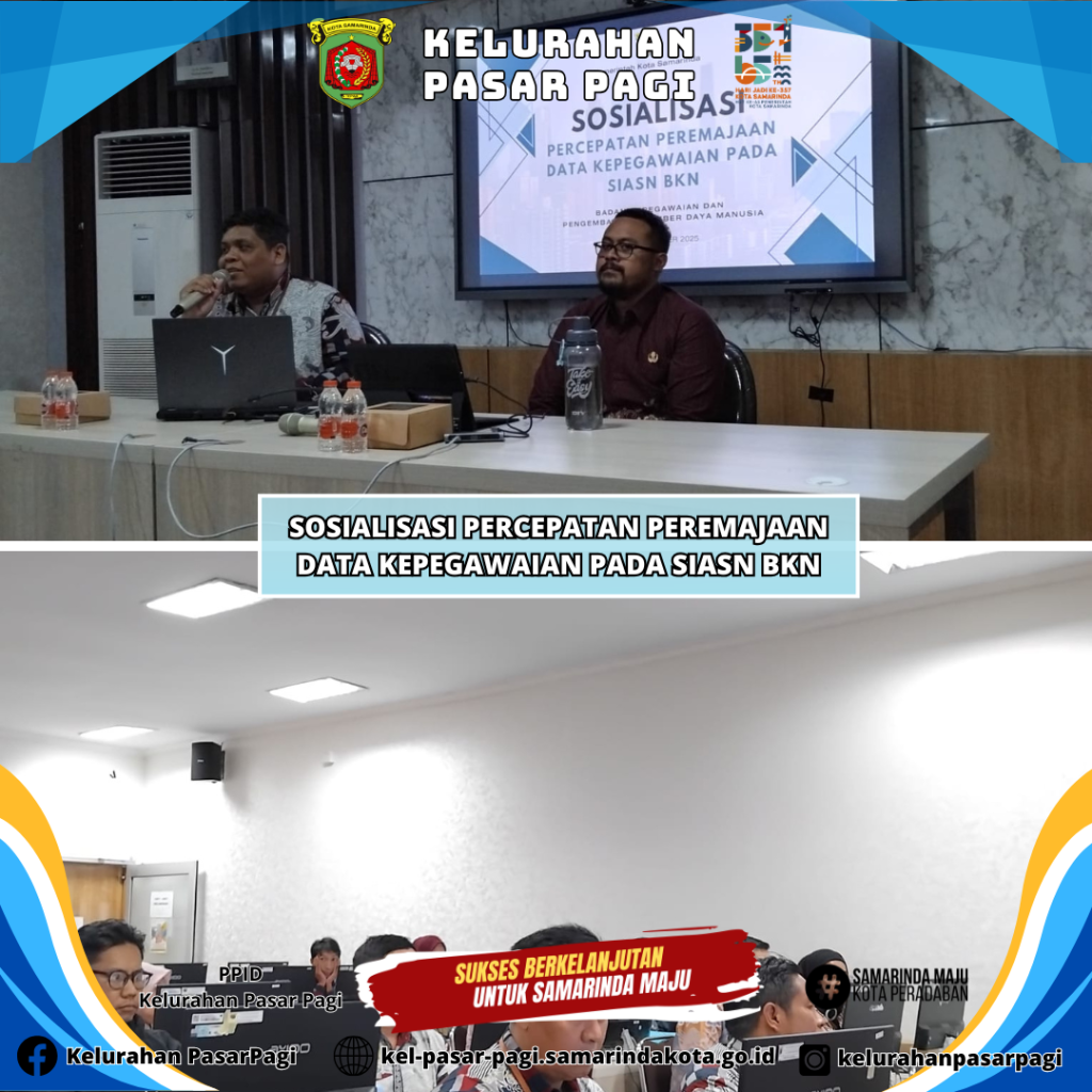 Admin Kepegawaian Kelurahan Pasar Pagi menghadiri Sosialisasi Percepatan Peremajaan Data Kepegawaian Pada SIASN BKN yang dilaksanakan oleh BKPSDM Kota Samarinda. Ringkasan Materi Kegiatan Sosialisasi Percepatan Peremajaan Data SIASN BKN, antara lain :