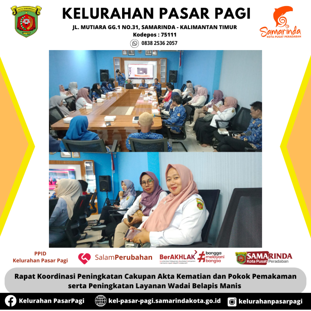Rapat Koordinasi Peningkatan Cakupan Akta Kematian dan Pokok Pemakaman serta Peningkatan Layanan Wadai Belapis Manis (Wadah Layanan Adminduk Terintegrasi Berbasis Aplikasi Mudah Aman dan Gratis) dalam rangka upaya peningkatan kinerja Disdukcapil Kota Samarinda agar lebih baik k...