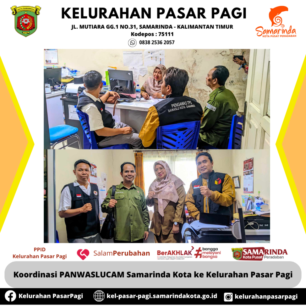 Bendahara PPS Kelurahan Pasar Pagi Agustina Herwintari, SH menerima kunjungan dari PANWASLUCAM Samarinda Kota. Muhammad Reza Bakhtimi (Ketua PANWASLUCAM SAMKOT) Melakukan koordinasi kepada Bendahara PPS Kelurahan Pasar Pagi terkait Pemilihan Kepala Daerah Serentak Tahun...