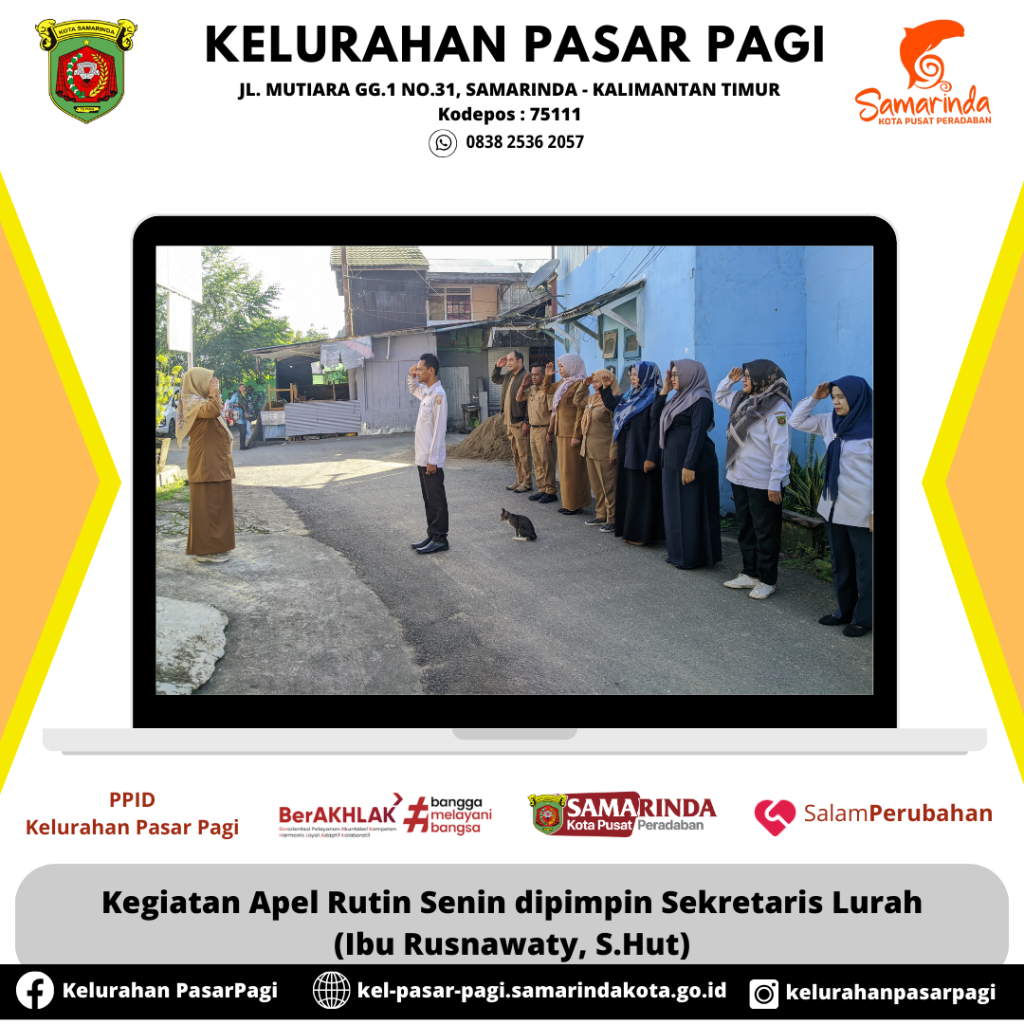 Kegiatan Apel Rutin Senin dipimpin Sekretaris Lurah (Ibu Rusnawaty, S.Hut) diikuti oleh Seluruh Staff ASN dan Non ASN Kelurahan Pasar Pagi.